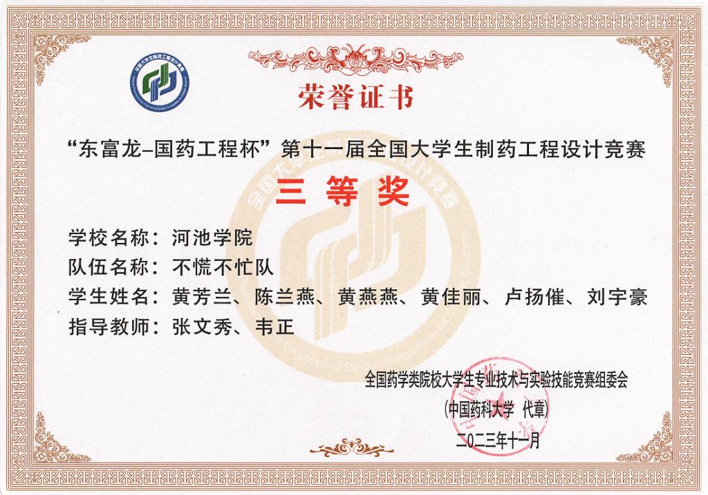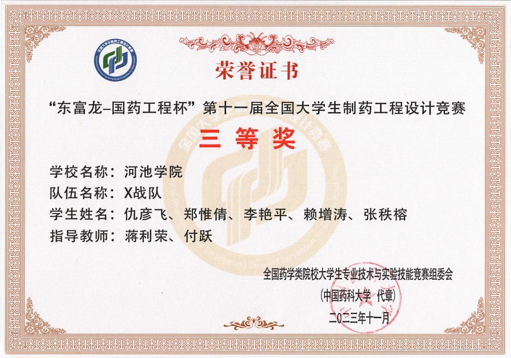 "东富龙一国药工程杯"第十一届全国大学生制药工程设计竞赛三等奖