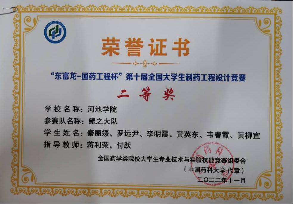 "东富龙一国药工程杯"第十届全国大学生制药工程设计竞赛二等奖
