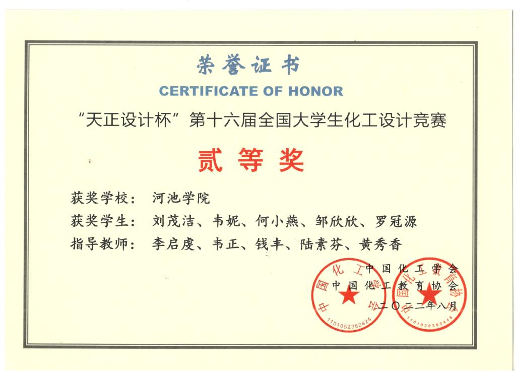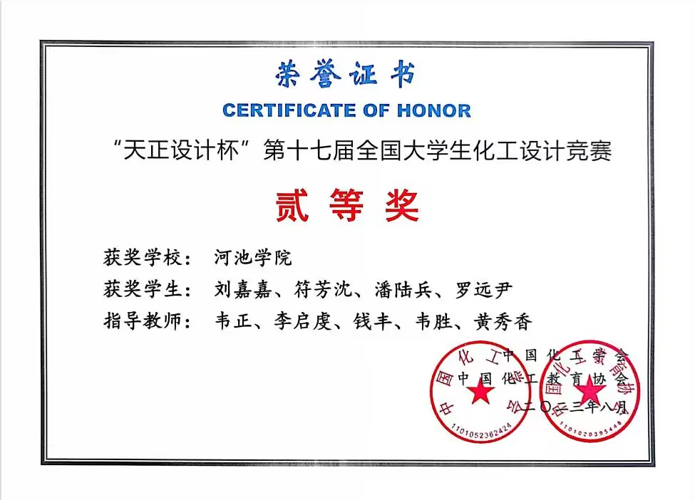 "天正设计杯"第十六届全国大学生化工设计竞赛二等奖