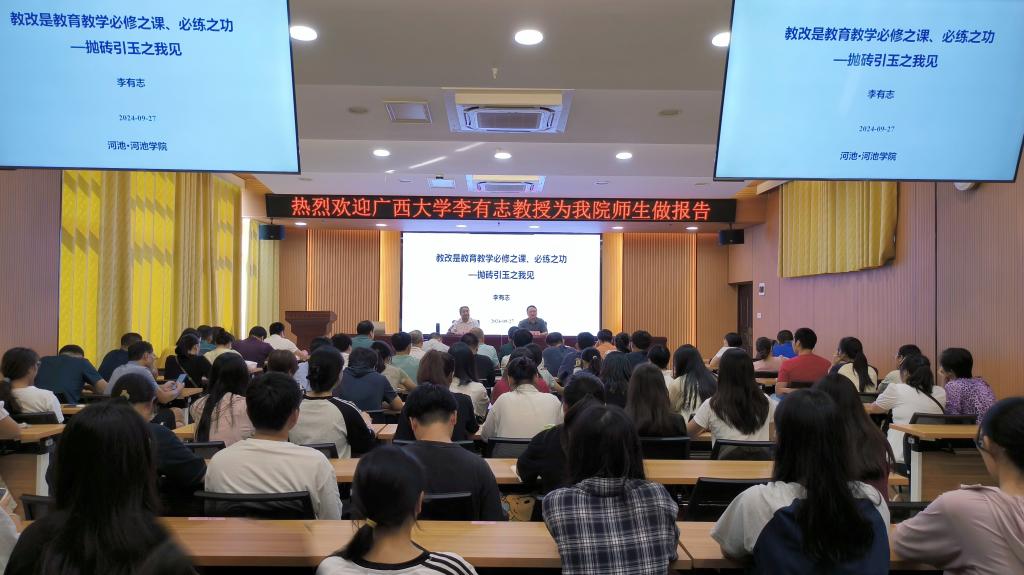 9月27日,广西大学李有志教授在格致楼101室为我校师生做《教改是教育教学必修之课、必练之功》专题学术报告,永利集团304am登录师生代表参加报告会,会议由学院院长李晓东主持。