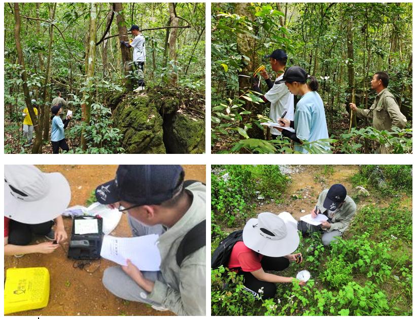 不同植物多样性的森林在保护环境缓减气候变化中所起的作用具有明显差异。实践调研队在木论自然保护区进行调研,根据空旷地、草地、树林等不同环境开展其植物群落生态因子调查,主要包括光照强度、空气湿度、空气温度、土壤pH、土壤温度等数据的收集;对保护区三十多种不同乔木样方的物种名称、胸径、高度、盖度进行数据统计。