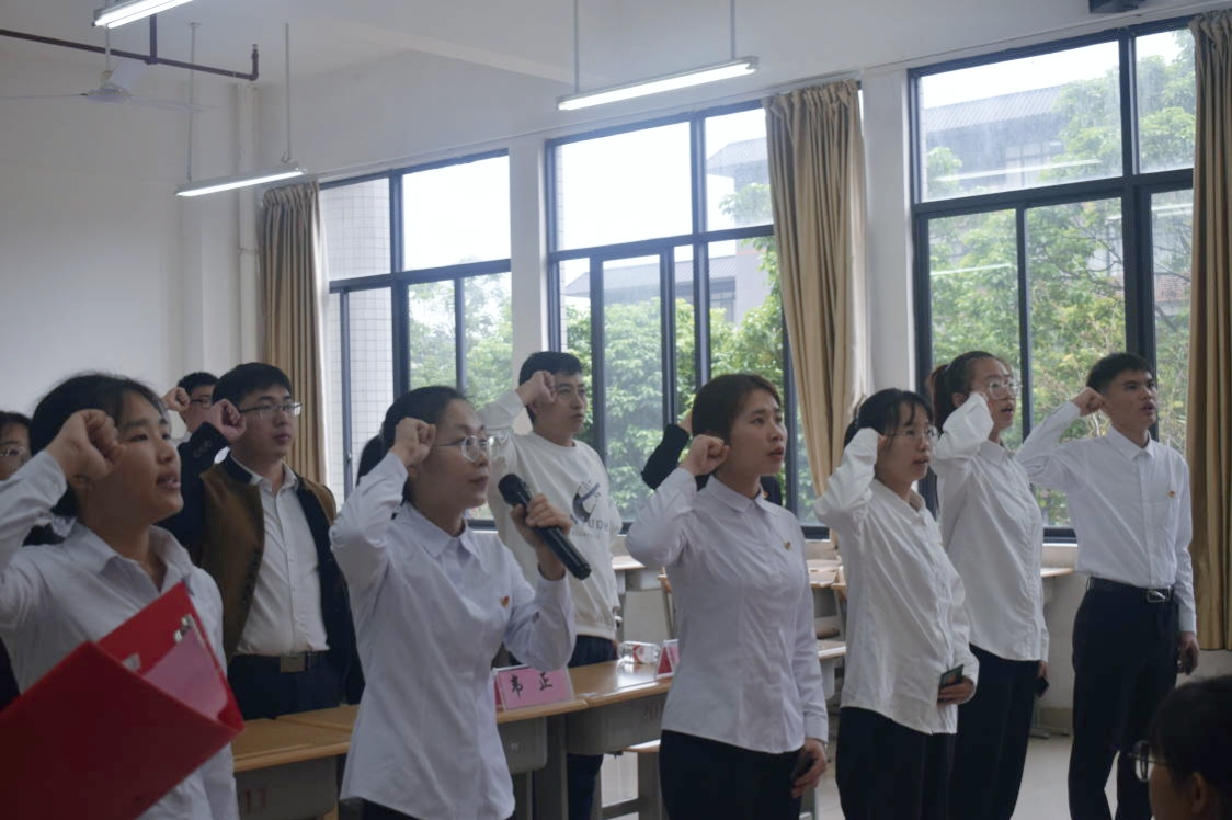 全体成员奏唱国歌完毕,主持人宣读新团员名单,韦正、王勇亮为新团员颁发团员证以及佩戴团徽,团委组织代表蒙子微带领新团员进行入团宣誓,入团介绍人阮春晓宣读《中国共产主义青年团章程》中有关团员的义务和权利的条款。