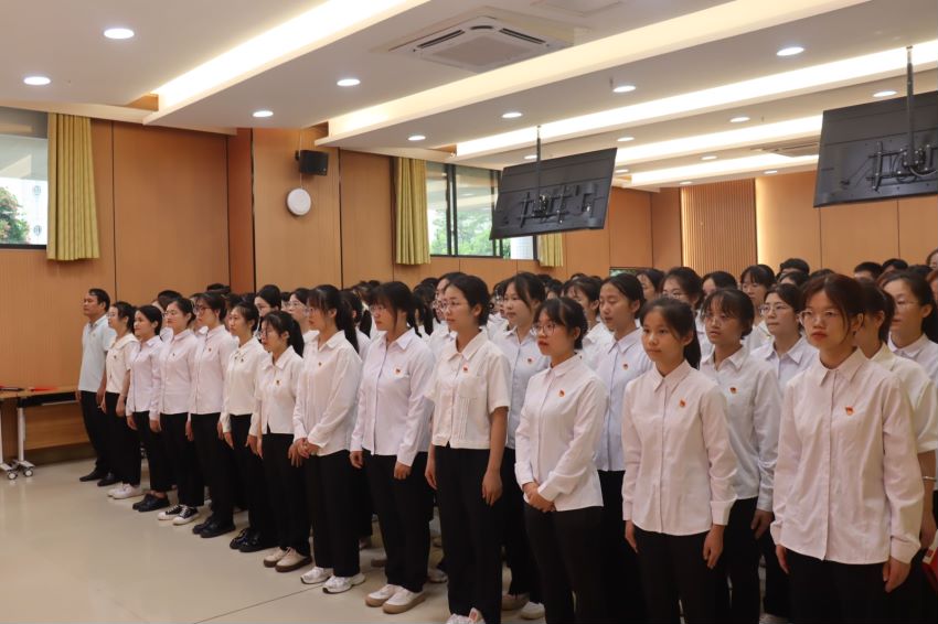 6月8日,永利集团304am登录在格致楼101教室举行“奋进新征程,忆初心、迎七一”新党员入党宣誓、老党员重温入党誓词仪式。学院党委书记覃宝山,党委副书记韦正,党委组织委员王勇亮出席仪式,各支部书记及学生党员参加仪式。