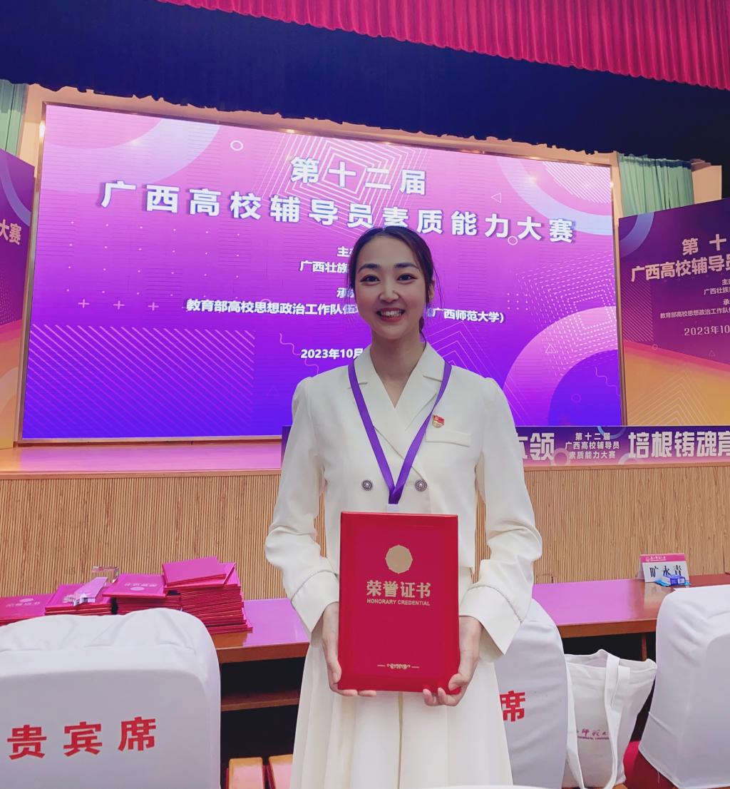 经过激烈角逐,永利集团304am登录辅导员谢恋情在本次大赛中荣获一等奖的优异成绩。本次比赛共分为基础知识测试、案例研讨、谈心谈话三个环节。全区高校共有92名辅导员参赛,经过基础知识测试后选拔64名选手参加案例研讨、谈心谈话环节比赛。比赛中,谢恋情沉着冷静,奋力拼搏,凭借扎实的理论知识和专业技能在大赛中脱颖而出。