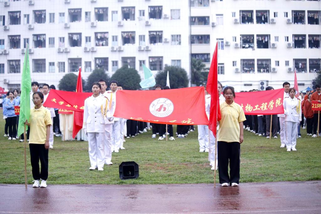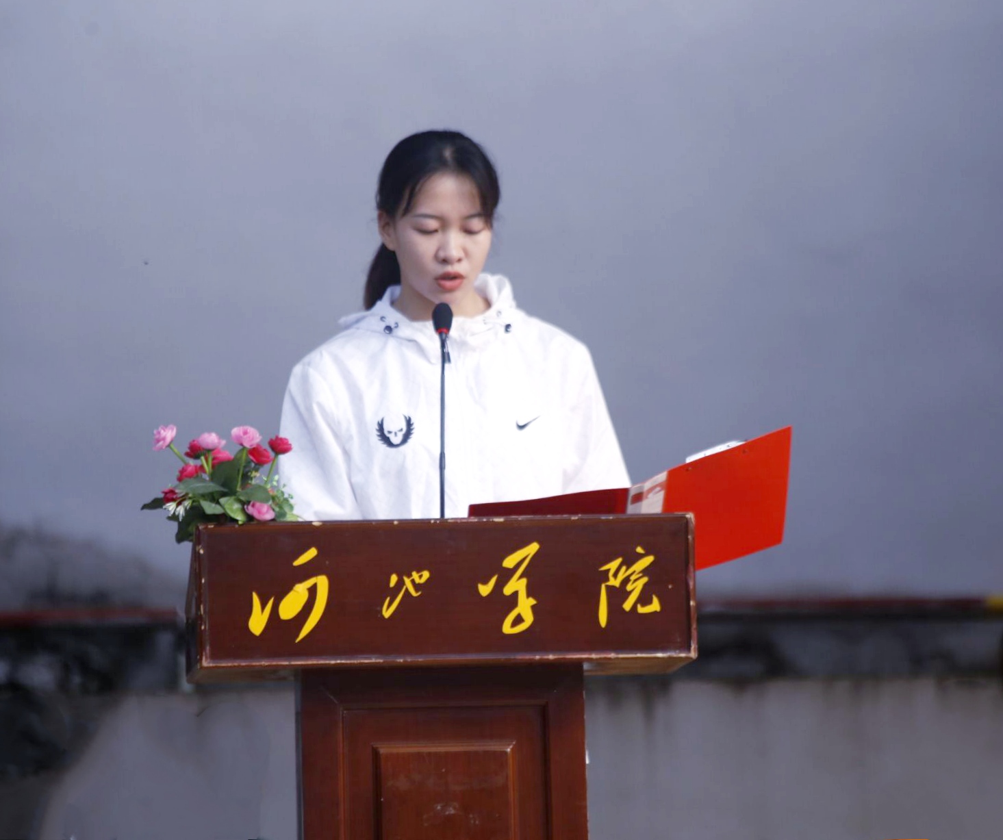 文学与传媒学院副院长覃永县致开幕词,他指出良好的身体素质是大学生成长成才的重要保证,运动会的举办不仅是要增强同学们的身体素质更是要展现青春的热情。他希望全体运动员能够发扬永不服输,不甘落后的运动员精神,在赛场上勇于拼搏;全体裁判员应坚持公平、公正、公开的原则,以保证各项竞赛的顺利进行;班级同学积极参与集体活动,为运动员呐喊助威,为班集体做出贡献。