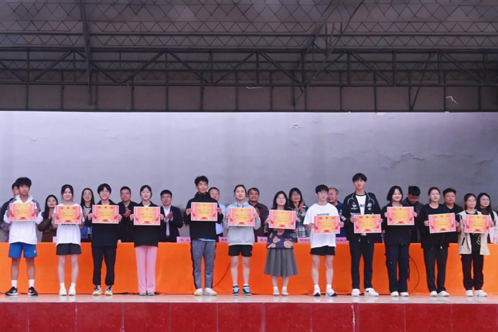 本届田径运动会包含17项赛事。赛场上,运动健儿们挥洒汗水,尽情释放自己的力量与激情,凭借坚韧不拔的毅力和挑战自我的决心创下多项佳绩。闭幕式上,文学与传媒学院副院长覃永县为本届田径运动会致闭幕词,他向在比赛中脱颖而出,荣获佳绩的同学表示热烈祝贺,同时向为运动会顺利进行而默默付出的全体工作人员表示衷心感谢。文学与传媒学院党委副书记韦振宇宣读比赛成绩和获得团体奖、精神文明奖的班级名单,学院领导为获奖班级颁发奖状。