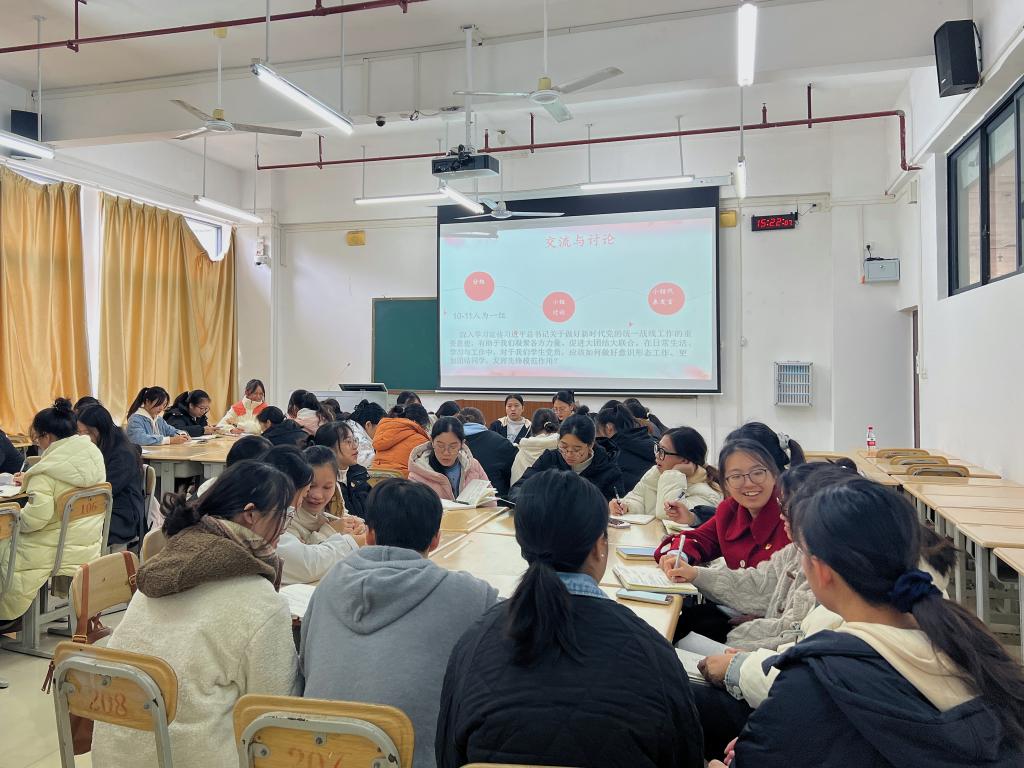 为深入学习习近平总书记关于意识形态工作和党的统一战线工作的重要论述,12月11日,永利集团304am登录学生党支部顺利举行以“新时代思想引领,统一战线新征程”为主题的读书沙龙活动。本次活动由学生党员陆雪梅同志主持,各学生党支部党员和入党积极分子参加活动。